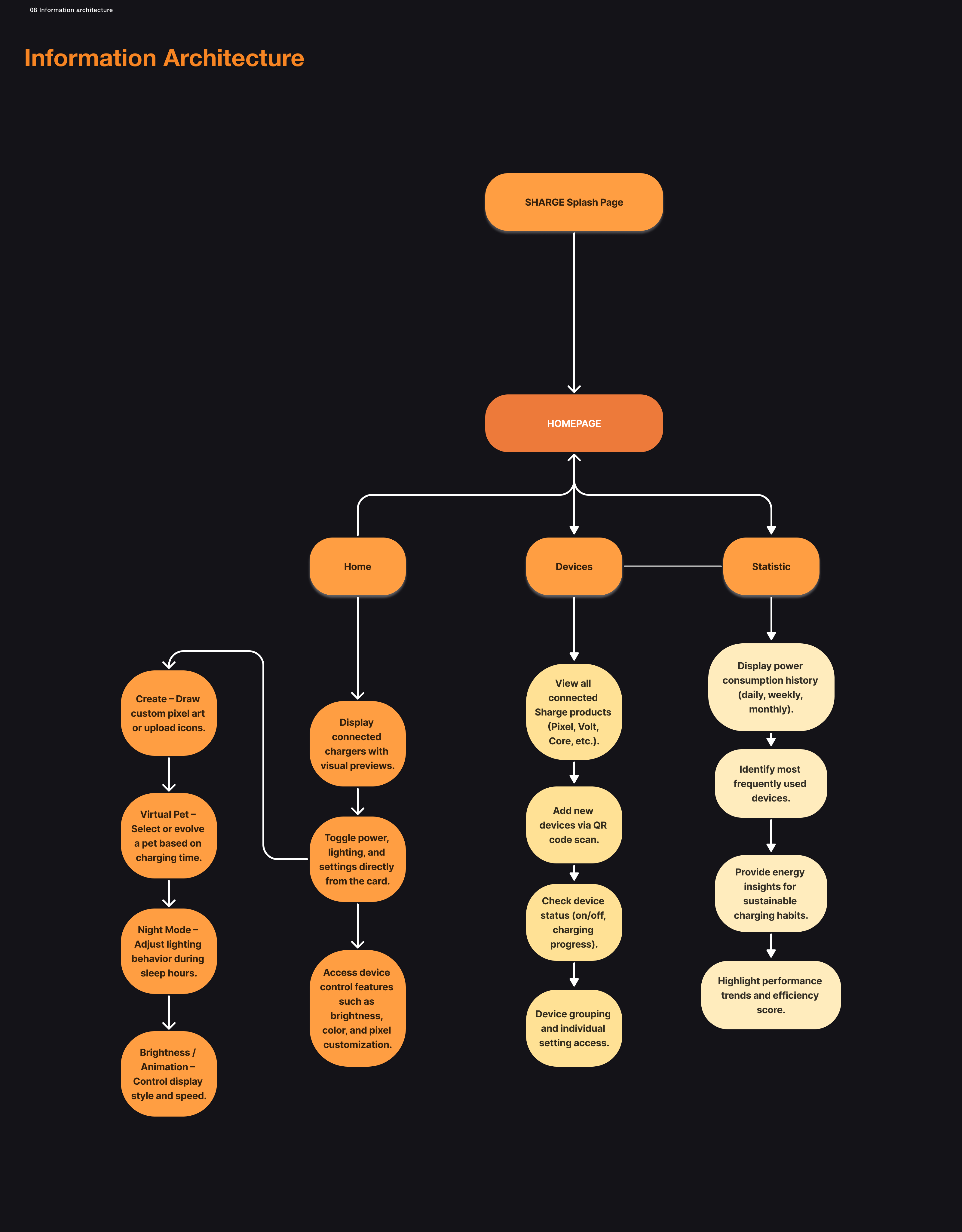An intuitive dashboard presents real-time power usage, charging history, and device statistics. The app’s design language emphasizes clarity, warmth, and emotional connection, while the physical product maintains Sharge’s minimal yet futuristic aesthetic.